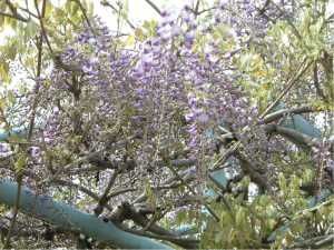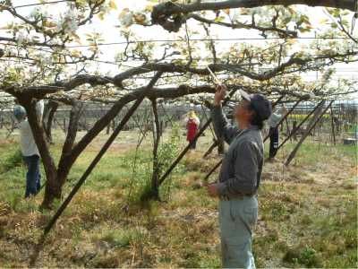 ○梨の花粉つけをしました。4月29日から5月5日にかけて、小杉さんの梨 園では花粉をつける作業を行いました。この期間は雨も余り降らずに、わり と順調に作業ができました。梨の木の枝全部に白い花が咲いています。開花 時期としては例年になく遅かった昨年と同じくらいとのこと。伸びている多 数の枝に咲いている花一房一房に花粉をつけたぼんぼんで触っていく、単調 だけれど根気のいる作業です。8月上旬からおいしい梨が収穫できます。