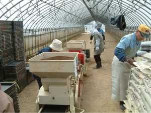○稲の種まきをおこないました。今月上旬は稲の種まきが盛んにおこなわれ ました。前段の作業である種籾を水につける仕事は3月中旬からおこなわ れています。一番最初に行う種籾消毒は、以前は農薬を使っておこなって いましたが、環境保全や安全性から、昨年から温湯消毒に切り替えています。 60℃のお湯に10分間漬けて、種籾についているいろんな雑菌を殺菌する ものです。その後、一週間から十日間、水につけて十分給水させたのち、 30℃の循環しているぬるま湯に二日間漬けて芽切れている状態にします。 その種籾を土の入った苗箱に機械で蒔き、ビニールハウスに並べ、上から 保温資材をかけます。暖かい日が続けば一週間くらいで芽が土の上に出て くるようになります。田んぼの作業は畦塗りが行われ、肥料散布やトラク ターでの耕起作業が続いておこなわれて、一番忙しい時期になります。