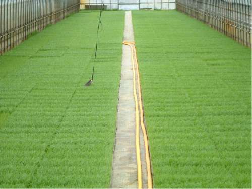 ハウスの中に置いた苗箱は一面緑の絨毯のように変わります。それまでには毎日