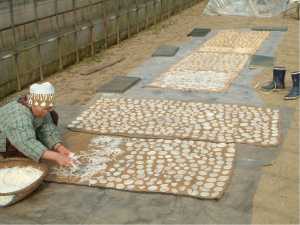 ○この時期恒例のホシカブ作りです。秋に収穫して保存していた大根、この ころになるとスがあいたり痛みはじめて保存がきかなくなります。残った大 根の皮をむいて薄く切り、さっとゆでてから日光で数日乾かします。甘みが 増えて、大根の保存食になります。煮物など味付すると歯触りもよくおいし く食べられます。