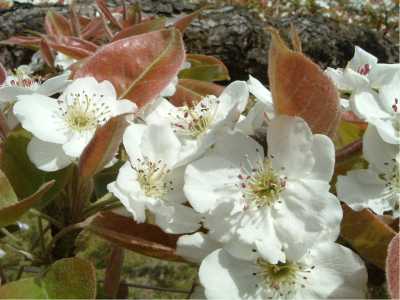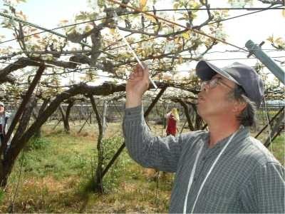 ○梨の花粉つけをしました。4月末から5月初めにかけて、会員の小杉さん の梨園ではめしべに花粉をつける作業を行いました。梨の木の枝全部に白い 花が咲いています。この日の品種は二十世紀、同じ品種の花粉では交配しな いので新興の花粉を採集し、耳かきのぼんぼんの大きなものに花粉をつけて 花に触ります。一本の木から伸びている枝に沿って咲いている花一房一房に 触っていく、単調だけれど根気のいる作業。初心者はうっかり隣の木の枝に 進んでしまうことも。常に上を向いているために首と肩が疲れてしまいます。 二週間ほどで花の基がふくらんでくるため受粉したことがわかります。 その後、摘果作業を三度にわたって行い、袋かけなどを経て、小杉さんの梨 園では8月上旬からおいしい梨が収穫できるようになります。