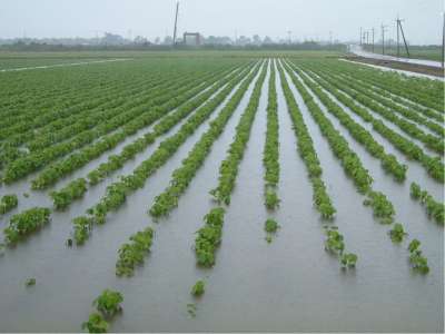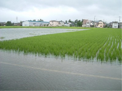 ○田んぼも海のようになってしまいました。今の時期はコシヒカリの茎の中 にある小さな穂が徐々に大きくなり始める時期に当たります。稲は大豆と違い、 もともと水の中で育つ植物ですので、写真の程度の水量ではすぐにだめになる ということはありません。しかし、穂を大きくしていくための体力を消耗する 時期であるために、連日水に浸かっていてはよくありません。例年梅雨末期の 大雨によって田んぼの水量が増すことがありますが、これほどの水がでたのは ここ数年なかったことです。今までの天候がほぼ順調できたので、残念なところ です。天候だけはどんなに優秀な栽培者でもどうにもなりません。豪雨の被害を 最小限に抑えて稲の成長を促すことが今後の管理の要点になります。