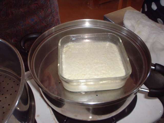 こちらは少しでも早く固めるために蒸し器で加温しています (タッパーが熱で変形してしまった)